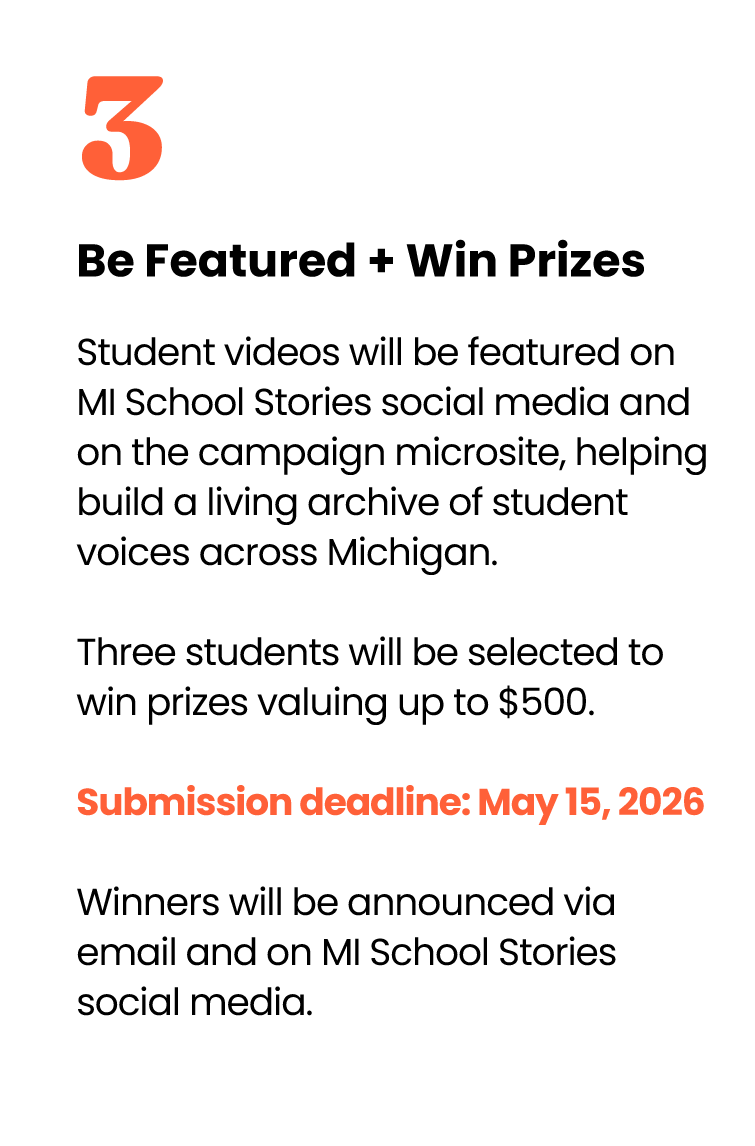 MI School Stories invites students to share their own experiences and perspectives, putting their voices at the center of the narrative around public education in Michigan.